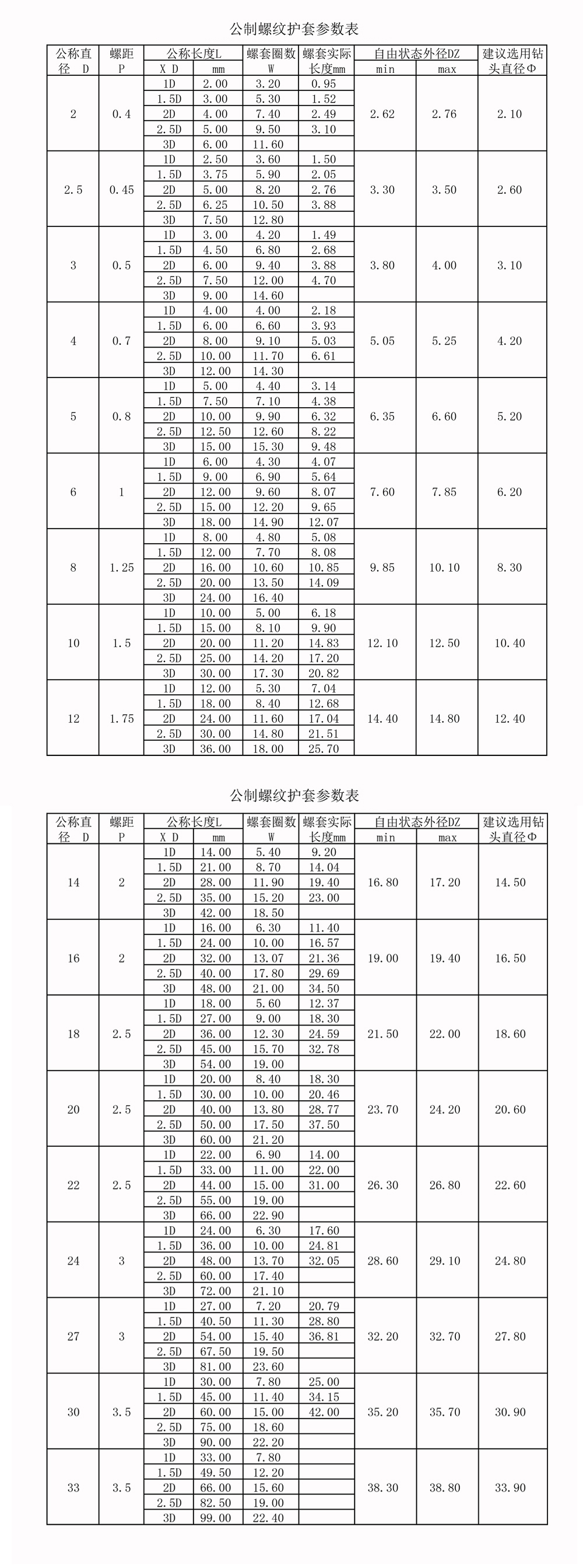 鋼絲螺套的公稱長度為安裝后長度,因為鋼絲螺套就長度上而言,在自然狀態下是處于收縮的,所以當鋼絲螺套裝進底孔后,會隨著底孔螺紋伸展開來,此時鋼絲螺套形成的螺紋深度,就是公稱長度。在加工鋼絲螺套底孔時,底孔攻牙的有效螺紋深度,-定要大于螺套的公稱長度,確保螺套包裹于底孔螺紋之內。