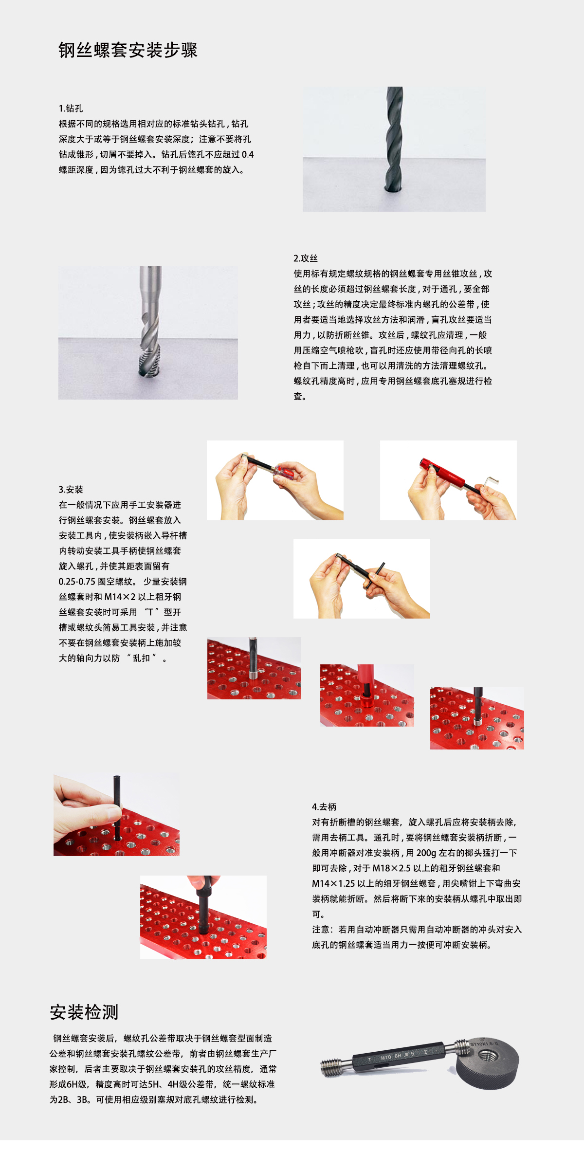 在鋼絲螺套長度的選擇上,通孔情況下,直接根據工件的板厚來確定使用螺套的長度即可,螺套可以稍短但不可以超過板厚。盲孔情況下,根據有效螺紋深度選擇合適的螺套長度,并且要預留空間保證鋼絲螺套安裝柄正常沖斷。如果孔底與有效牙底距離較小,影響安裝柄沖斷,這時要么孔深加大,要么選用再短一級的螺套即可。